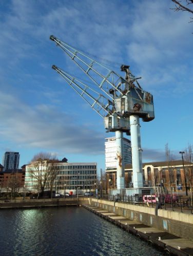 Cleansed of a thriving dock community, the area to-day has almost a Stepford Wives aura. There are many flats, from which hardly anyone seems moves in or out of, sitting amongst the prestigious Lowry Theatre and Imperial War Museum. The only signs left of the past are the art deco dock office and two large cranes. The cranes were erected on south dock 6 (now known as Merchants Quay and Clippers Quay) in 1966, but were decommissioned in 1988 when they were moved to their present home.