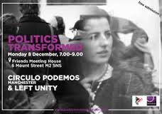 …about Podemos (it means “we can”) who are a social democratic political party in Spain started in 2014. Strangely founded by a writer and talk show host! Having said that they are now the second largest Spanish party in terms of membership (200,000) and received 8% of the vote in the European Parliament elections in 2014. There is, apparently, a Podemos Manchester, who seem to be a group of Spanish people living here who show Spanish films followed by a discussion. This meeting was organised by them in conjunction with Left Unity to talk about Podemos in Spain and how it is transforming society. Only worrying thing for me is that like the Peoples Assembly there is no mention of class see