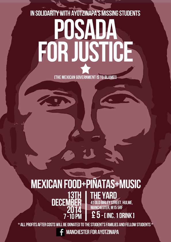 …with the parents of the 43 missing students in the small Mexican town of Ayotzinapa at a fund-raising Mexican ‘posada’ on 13th December 2014 / 7pm to 10pm.. A ‘posada’ is part of a traditional nine-day celebration in Mexico before Christmas. In this posada you can have fun, dance and try some typical Mexican food and drinks. As in all traditional posadas, ‘piñatas’ will be beaten. The admission cost is £5 and it includes a drink. All profits after costs will be donated to missing students’ families . Further info see