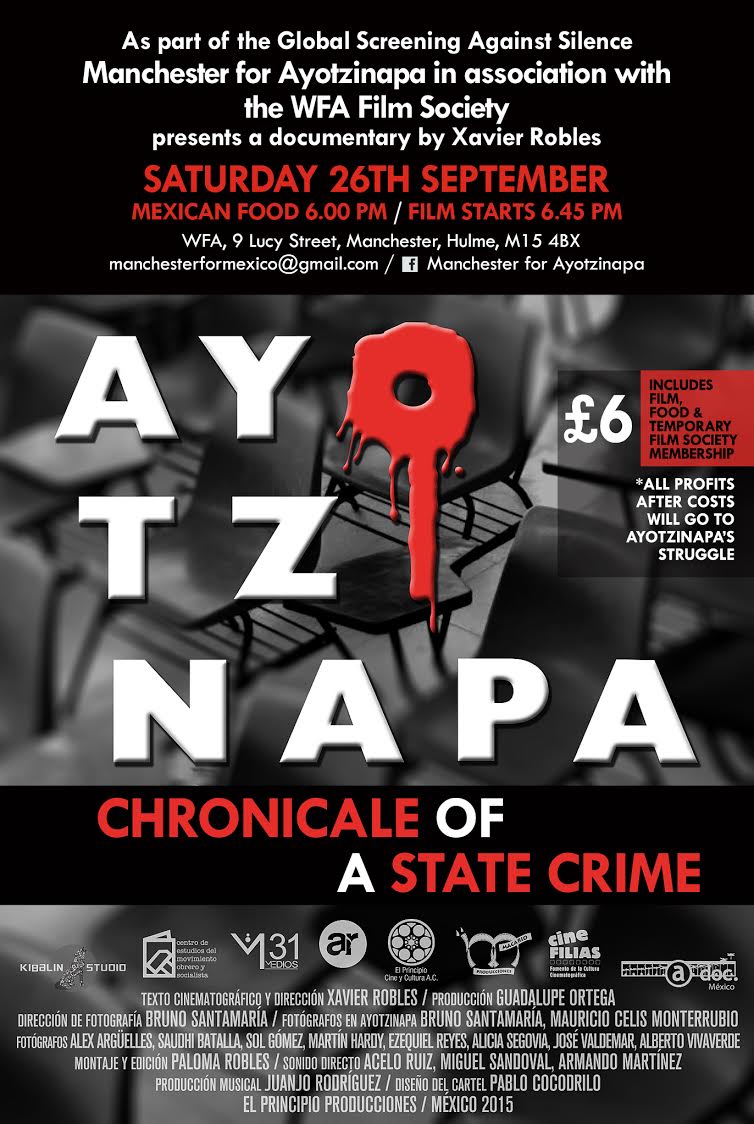 The 43 student teachers who were “disappeared” from Ayotzinapa in Mexico nearly a year ago. The Manchester for Ayotzinapa Campaign goes on to support the parents and find out where they are. On 26 September they are showing a documentary “Ayotzinapa: Chronicle of a State Crime” by director Xavier Robles. Food will be served at 6 and the screening starts at 645pm. Cost;£6. Profits will go to the campaign. Venue; Workers Film Association,9 Lucy Street, Hulme M15 4BX. Further details contact manchesterformexico@gmail.com