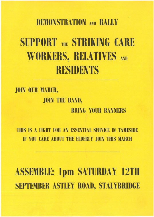 An independent support group for the strike was also set up in Manchester which the local Unison Branch Secretary was not keen on; he said it might “bring the strike into disrepute if linked with other actions.” But this was disregarded by the strikers. Martin Ralph of the group produced a pamphlet on the dispute “Support Tameside care workers: good wages, conditions and care are indivisible ” which is in the archive at the WCML.
